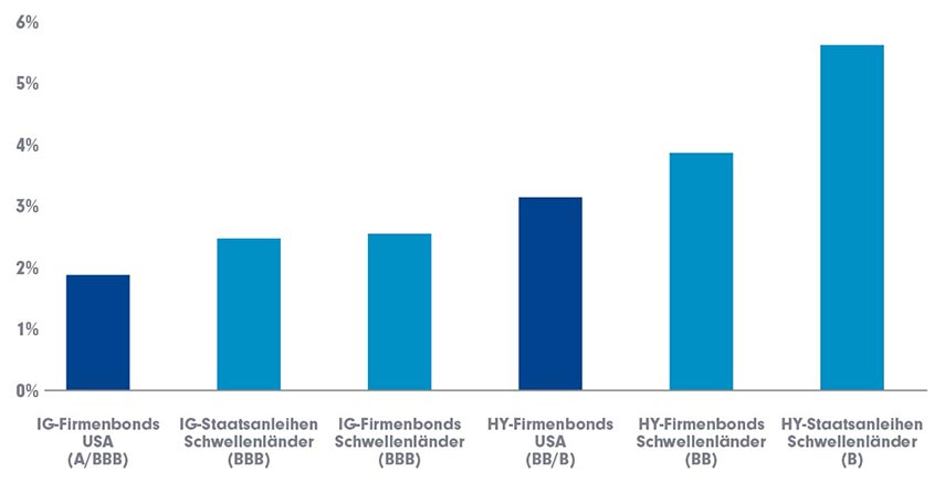 Näherungswerte der Indizes: IG-Firmenbonds USA –BBG BC US Corp. IG; IG-Firmenbonds Schwellenländer – JPM CEMBI IG Global Div; IG-Staatsanleihen Schwellenländer – JPM EMBI IG Global, HY-Firmenbonds USA – BBG BC US Corp HY; HY-Firmenbonds Schwellenländer – JPM CEMBI HY Global Div; HY-Staatsanleihen Schwellenländer – JPM EMBI HY Global Div