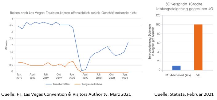 Zudem könnte die Kombination von 5G-fähigen Minigeräten und größeren Bildschirmen den Bedarf an sperrigen Laptops verringern. Mehr Homeoffice bedeutet zudem weniger Energieverbrauch im Transportwesen. Einige Frühindikatoren deuten darauf hin, dass der Geschäftsreiseverkehr wahrscheinlich deutlich unter dem Niveau von vor der Pandemie bleiben wird (siehe Grafik unten links).