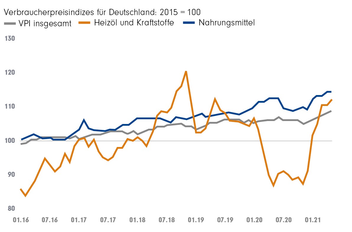 Bei der Veröffentlichung der Inflationsraten für Mai 2021 verwies das Statistische Bundesamt allerdings darauf, dass der zugrundeliegende Verbrauchpreisindex bisher vor allem durch den Anstieg der Energiepreise getrieben wurde. Hier haben sich temporäre Sondereffekte erhöhend auf die Teuerungsrate ausgewirkt – insbesondere die zu Jahresbeginn eingeführte CO2-Abgabe sowie die niedrigen Preise für Energieprodukte vor einem Jahr (Basiseffekt). Ohne Energiekosten wären die Verbraucherpreise hierzulande nur um 1,8% im Vergleich zum Monat des Vorjahres gestiegen.2